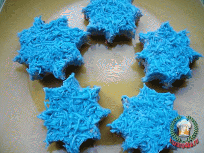 Затем на снежинки выложить окрашенный белок, слегка приминая по контуру звездочки.