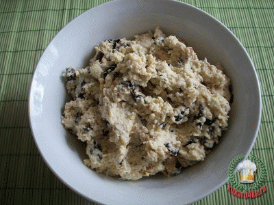 Приготовить начинку. Потереть на терке адыгейский сыр и желтки, добавить измельченные орехи, чеснок и мелко нарезанный чернослив. Влить майонез, посолить и хорошо перемешать (майонез добавлять постепенно, консистенция начинки должна быть не жидкая и не сильно сухая).
