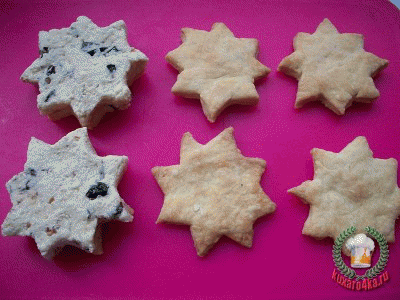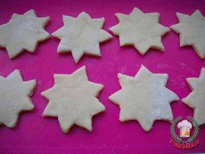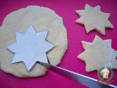 Вырезать из картона лекало в виде восьмиугольной звездочки. Достать тесто из холодильника и нарезать на небольшие кусочки. Каждый кусочек раскатать и приложив лекало, вырезать при помощи ножа звездочки. Выложить их на смазанный противень и выпекать в духовке при 180°C до готовности.