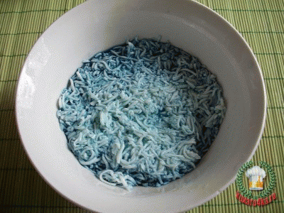 Вареные яичные белки потереть на мелкой терке и залить соком красной капусты разбавленным водой 1:1. Через 1-2 минуты откинуть белки на сито, чтобы стекла лишняя жидкость.