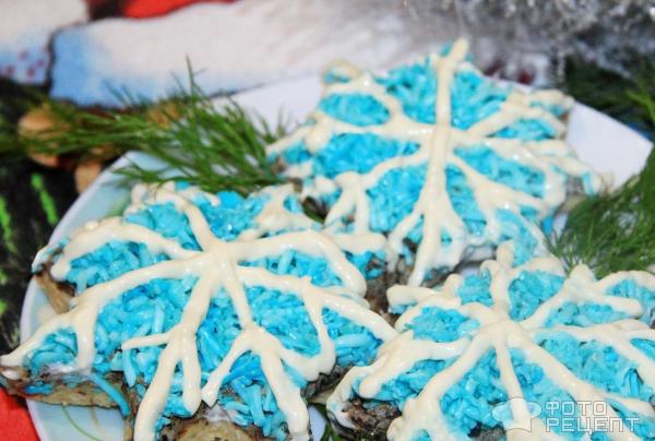 Сверху нарисовать майонезом снежинки (сделать это можно при помощи кондитерского мешка или положить майонез в угол целлофанового пакетика, скрутить в кулечек и проткнуть маленькое отверстие ножом).