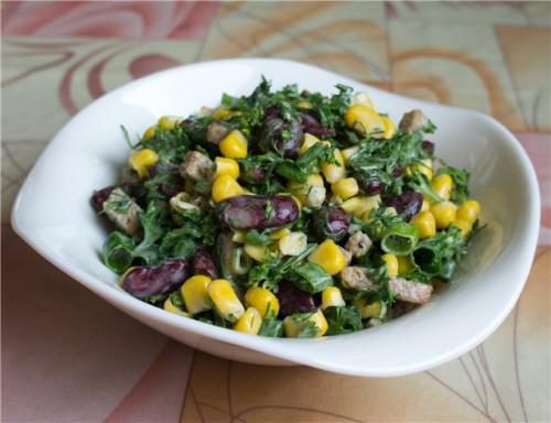 Можно приготовить из фасоли с кукурузой и более простой салат: просто смешайте их, добавив любые сухарики на ваш вкус и майонез.