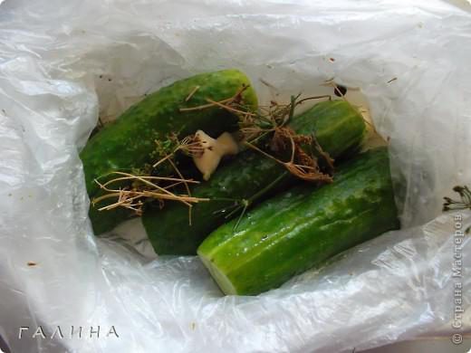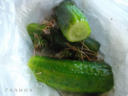 Итак. Огурчики выбираем небольшие и примерно одинаковые по размеру. Большие можно нарезать крупными кольцами. Моем, обрезаем с обеих сторон "попки" и кладем......в полиэтиленовый пакет, для надежности (вдруг есть дырочка) или проверяем, набрав воды, или кладем в два пакета.