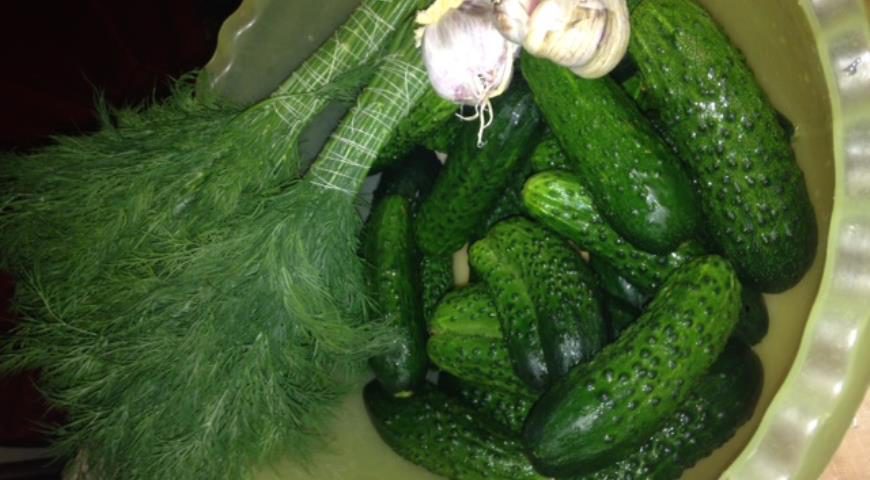 Помыть щёткой под проточной водой огурцы. Положить их в миску или тазик с водой, чтобы они были покрыты водой и дать постоять столько, сколько есть времени. Но не более 10-12 часов. Воду слить. Удалить кончики у огурцов с двух сторон.
