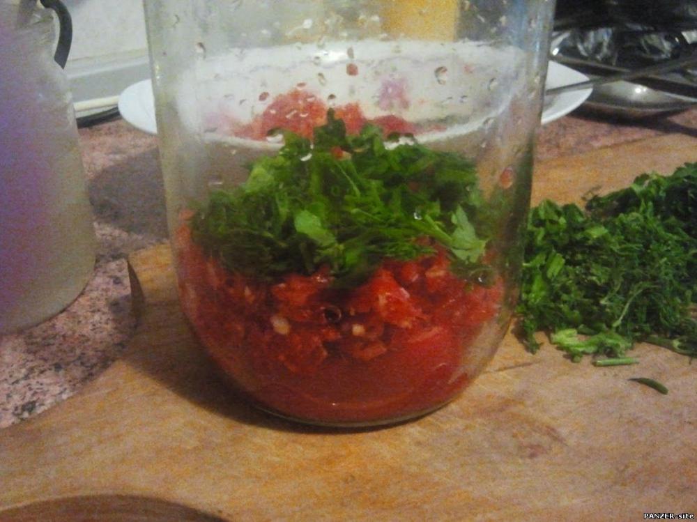 Теперь укладываем в банку все слоями: помидоры – заправку - зелень, а в конце заливаем маринадом.