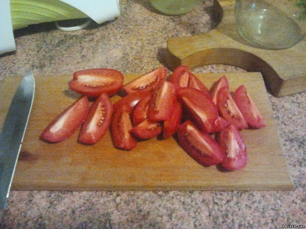 Первым делом режем помидоры на четвертинки.