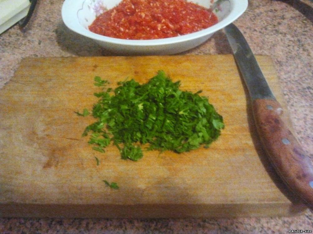 Зелень мелко рубим.