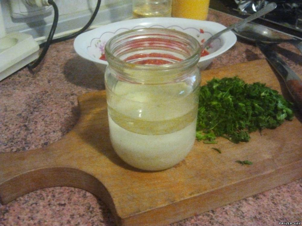 Ну и последний подготовительный шаг – делаем маринад. Мешаем в посуде уксус, соль, сахар, растительное масло.