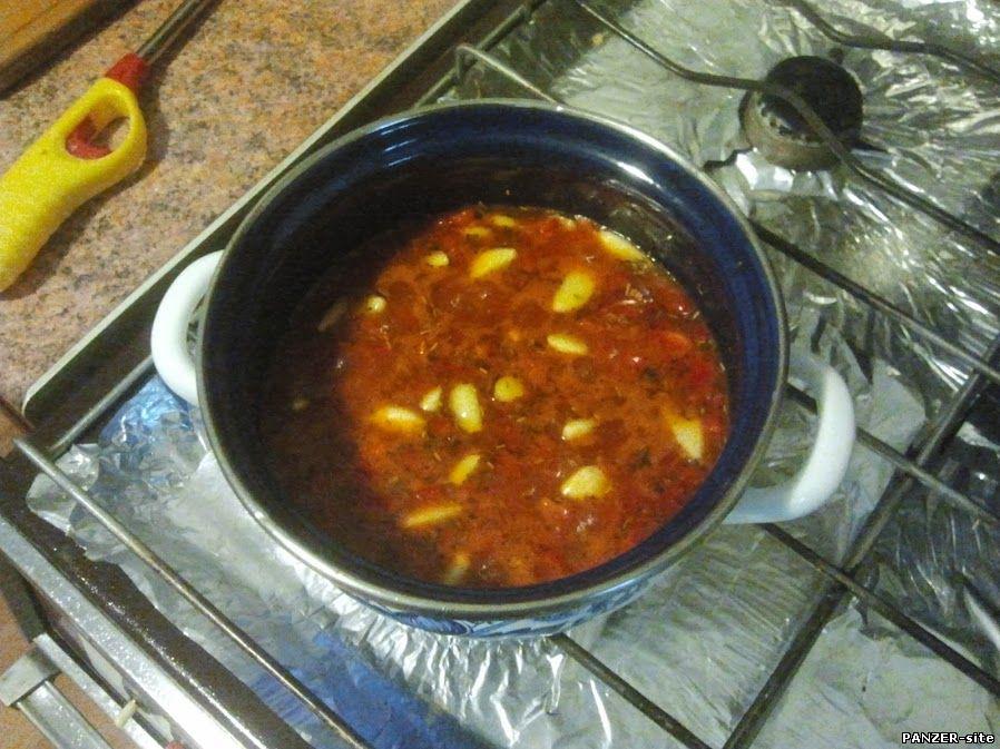Все перемешиваем и доводим до кипения. После закипания варим 1-2 минуты, так, чтобы чеснок не переварился, он должен остаться хрустящим.