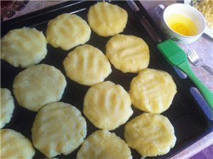 Дать тесту остыть. Противень смазать сливочным маслом (не густо) и выложить на него картофельные лепешки. Смазать яйцом.