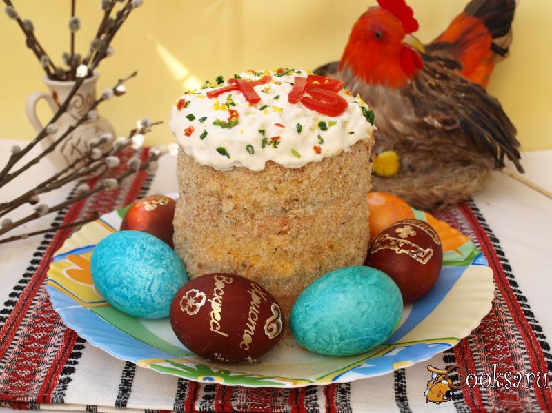 Бока салата обсыпать панировочными сухарями, а верх смазать сметаной, придавая форму глазури. Украсить этот замечательный, праздничный салат "Пасхальный кулич" вырезанными буквами из сладкого перца и кусочками свежих овощей, имитируя присыпку.