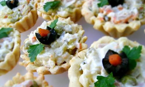 Весьма эффектный, нестандартный и неожиданный ход – подача оливье порционно в фужерах, бокалах или даже тарталетках.