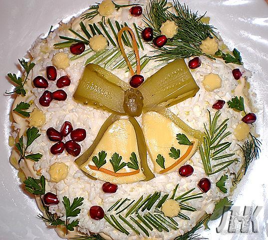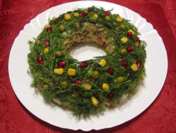 салат нужно выложить на плоское блюдо в виде острого конуса, воткнуть, начиная снизу, веточки укропа в виде веток, оформить верхушку звездой из сладкого перца, а по поверхности салата выложить зерна граната.