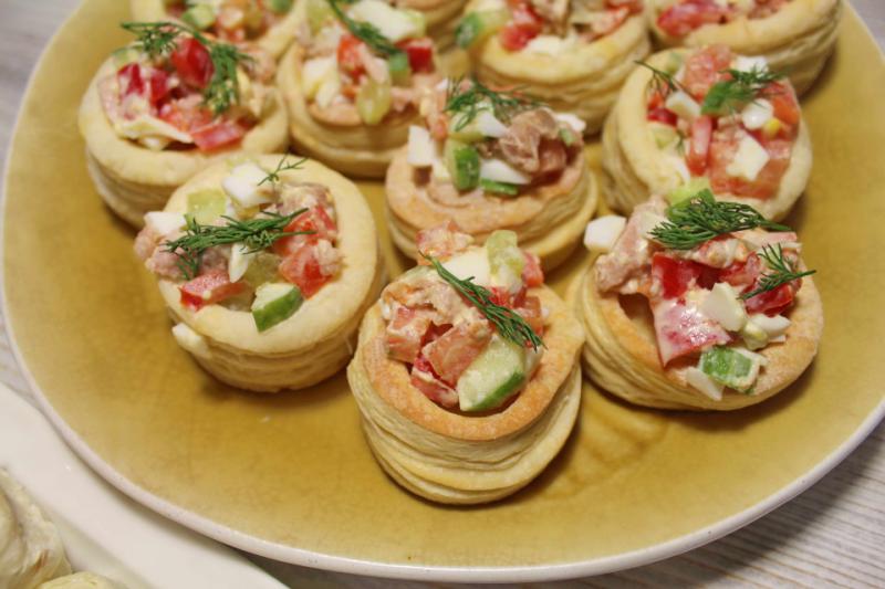 Приготовим отличную праздничную закуску: волованы (тарталетки) из слоеного теста с салатом из тунца, помидоров и огурцов. Такие волованчики выгодно отличаются от покупных тарталеток, они гораздо сочнее, не рассыпаются и не крошатся при надкусывании.