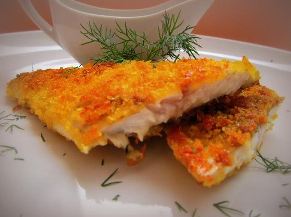 Далее обжарьте запанированное филе на прогретой сковороде с маслом. Каждую сторону жарьте по минуте. Когда рыба готова, полейте ее соусом и подавайте.