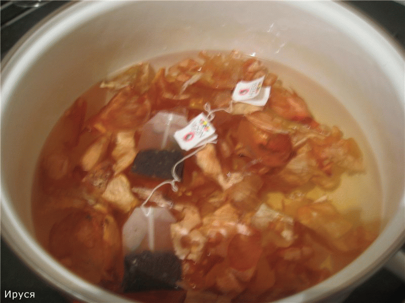 Ставим на огонь кастрюлю с водой, добавляем соль и луковую шелуху. У меня на 2, 5 литра воды - 2,5 столовых ложки соли с горкой. Если шелухи мало, можно добавить пару пакетиков чая.))