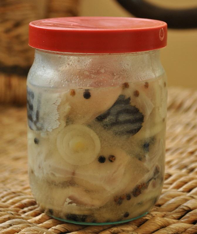 5. Рыбу сложить в миску вперемешку с луком, залить остывшим маринадом.