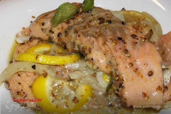 В миске взобьем лимонный сок, сахар, горчицу и масло, когда смесь станет гомогенной, польем ею семгу.