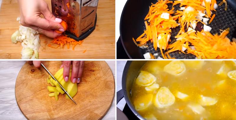 Лук нарежь кубиками, а морковь натри на терке. Брось измельченные овощи в кипящий бульон. Если ты готовишь суп на воде, слегка обжарь овощи на растительном масле.