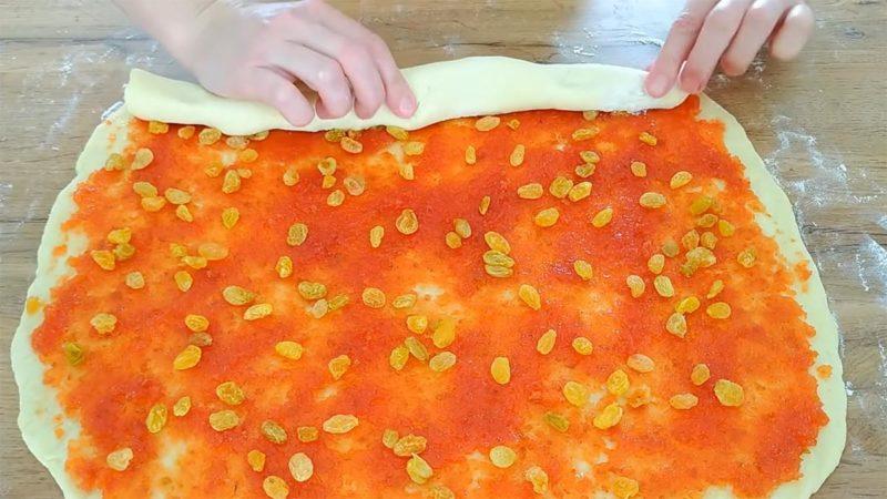 Сверху распределить тонким слоем густой джем + изюм. Свернуть в рулет.