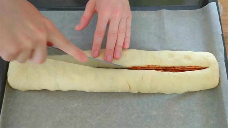 Рулет разрезать вдоль до конца.