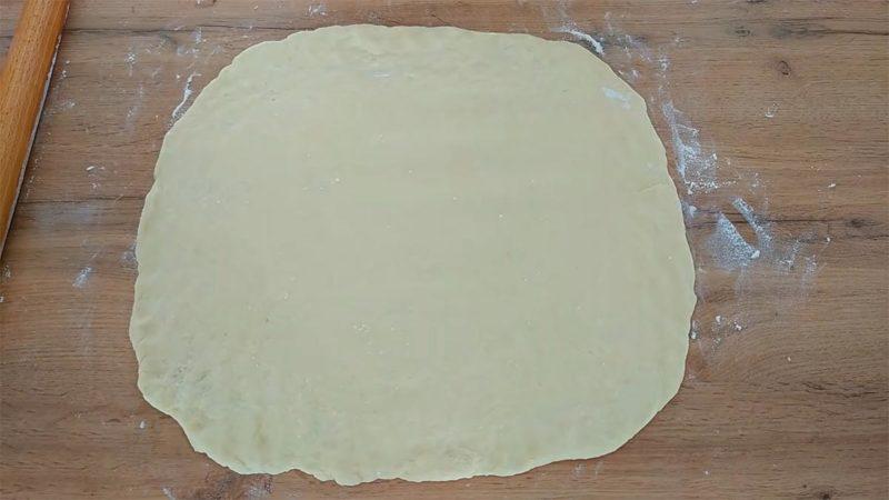 Сразу же раскатать тесто в тонкий пласт, стараясь придать ему форму квадрата.