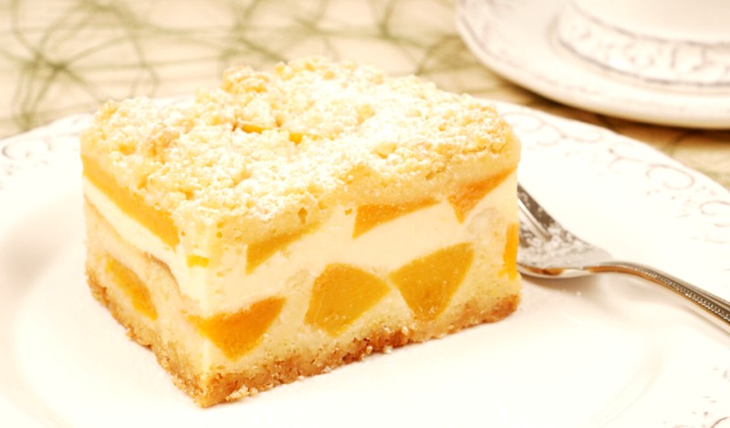 - Застелите форму пергаментом, выложите большую часть теста, разровняйте , выложите кусочки фруктов, снова разровняйте и выложите крем ровным слоем.