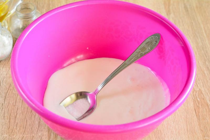 Влейте кефир комнатной температуры в миску, добавьте соду, немного соли (0,5 ч. л.) и перемешайте основу для пышного теста.