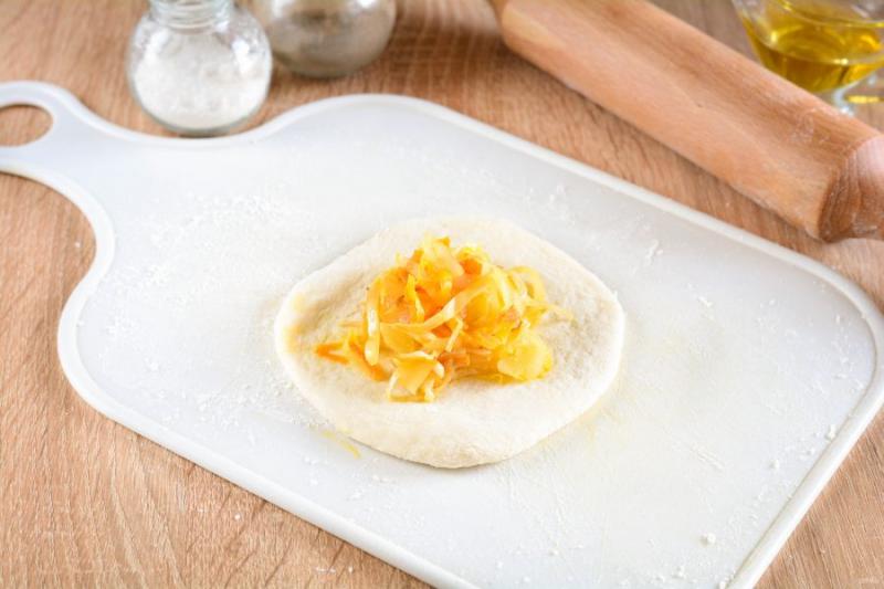 Каждый шарик раскатайте скалкой, но не сильно тонко, примерно толщиной 0,5-0,6 см. В центр выложите порцию начинки.