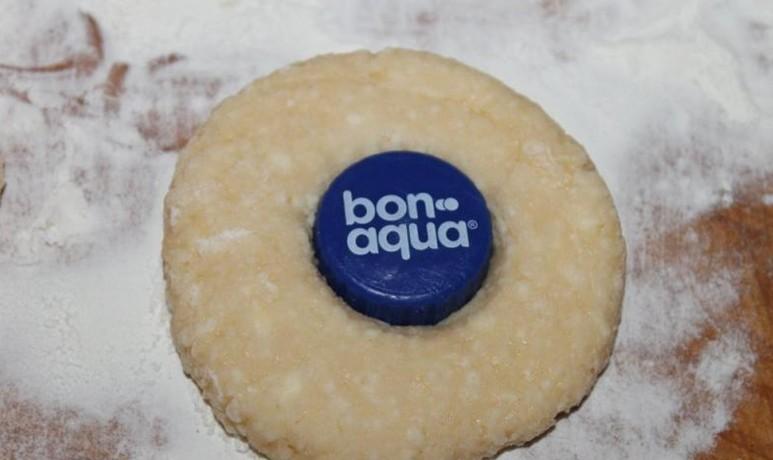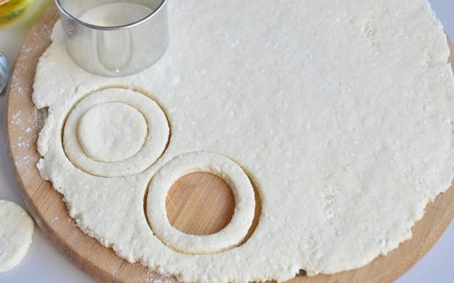 Налепить шарики, раскатать каждый в лепешку (не очень тонко), и вырезать крышечкой от бутылки отверстие в серединке.