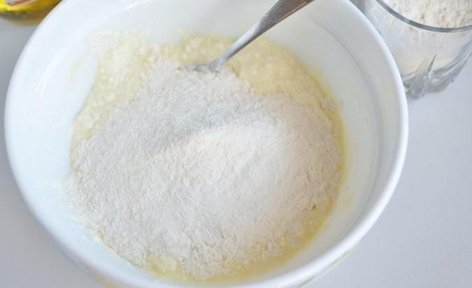 Отдельно смешиваем разрыхлитель с мукой. Вводим получившуюся смесь в тесто.