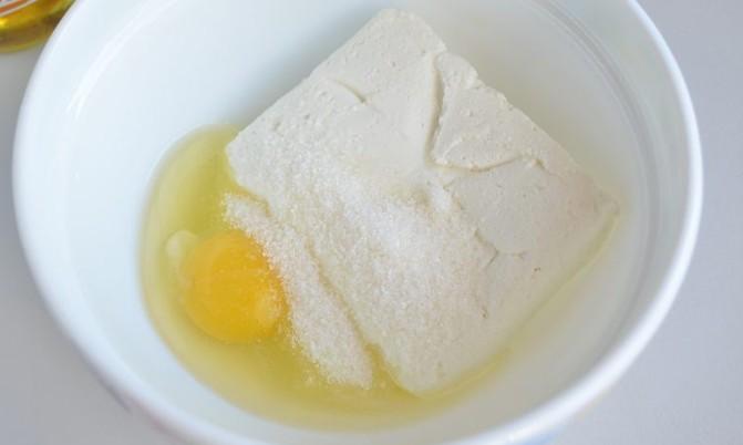 Выкладываем в миску творог. Добавляем к нему сахар и сюда же разбиваем яйцо. Перетираем все вилочкой.