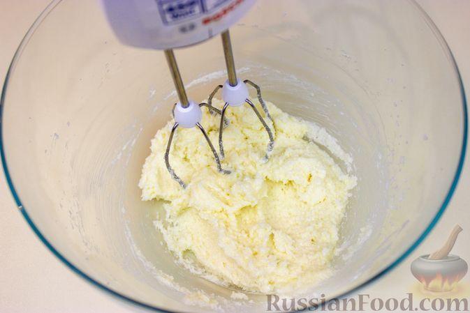 Размягченное сливочное масло, сахар и ванильный сахар взбиваем в течение 1 минуты.