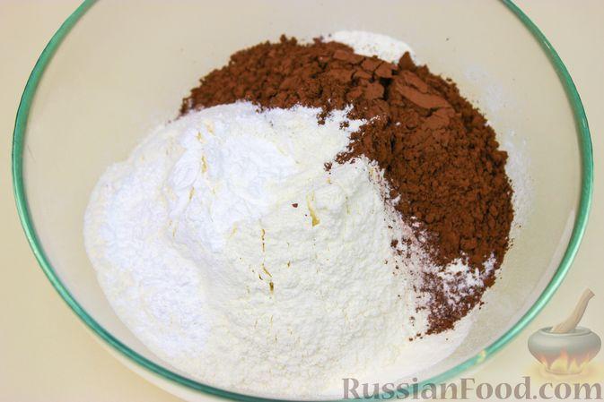 В миске смешиваем муку, какао, разрыхлитель, соль.