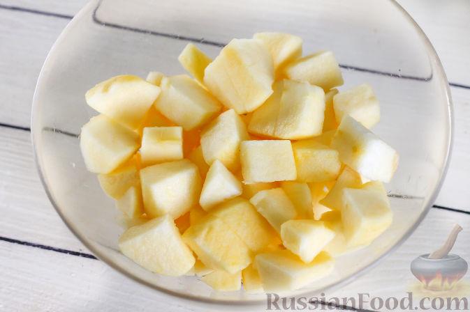 Яблоки очистите от кожуры и разрежьте на четыре части, вырежьте семена. Промойте еще раз и нарежьте кубиками.