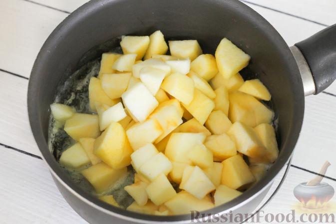 Выложите в емкость с маслом яблоки и потушите около 2-3 минут, стараясь не доводить их до мягкости.
