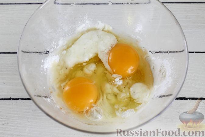 В миску просейте муку и сахарную пудру, добавьте соль и разбейте туда же яйца. Перемешайте.