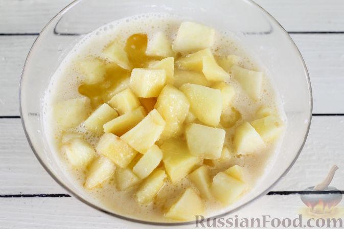 Добавьте в тесто яблоки вместе с растопленным сливочным маслом. Перемешайте.