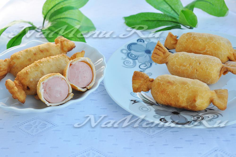 Для приготовления конфетки выбирайте сосиски, у которых оболочка натуральная. Они практически не разбухают, отчего не наносится повреждений тесту, которое следует раскатывать потоньше.