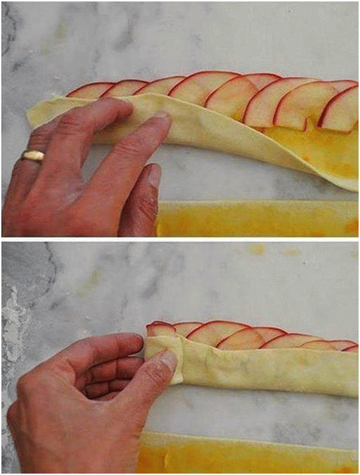 6. Раскатываем тесто, нарезаем полосками, смазываем джемом, раскладываем яблоки, можно присыпать корицей. И скручиваем.