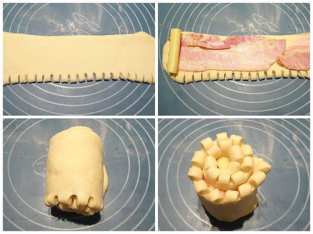 Для начинки использованы ломтики бекона, нарезанные на слайсере, и сыр — соломкой. Кладём на полоску теста бекон. На край полоски теста с беконом кладём сыр и сворачиваем полоску рулетиком. Получается вот такой «цветок».