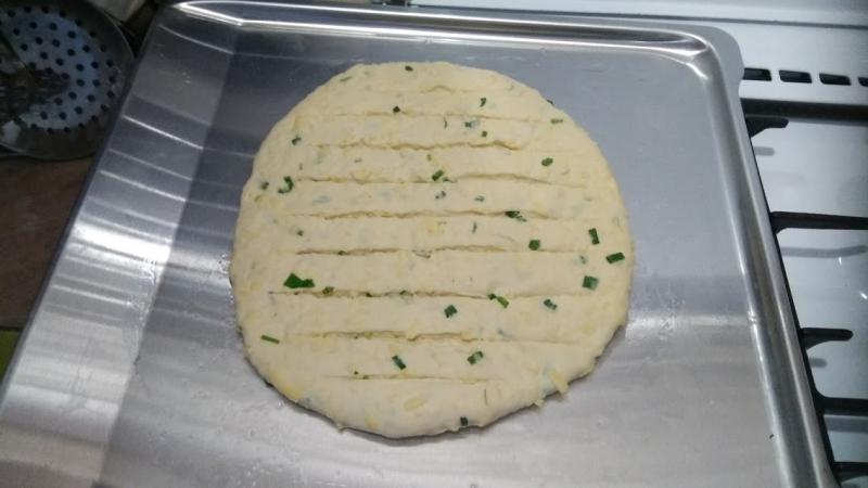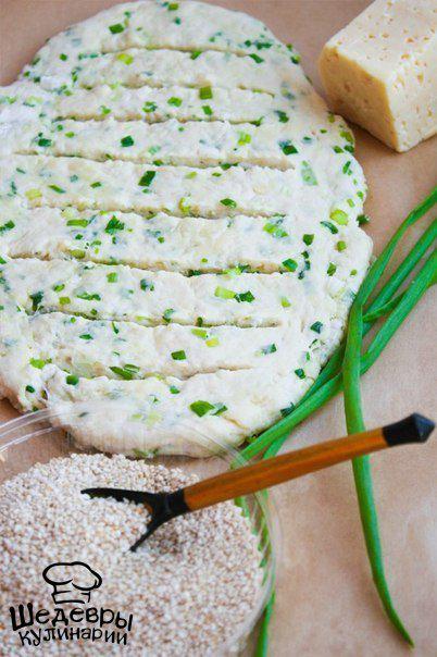 2. Добавляем муку, замешиваем тесто, в которое добавляем нарезанный мелко зелёный лук и сыр натёртый на крупной тёрке. Вымешиваем тесто.