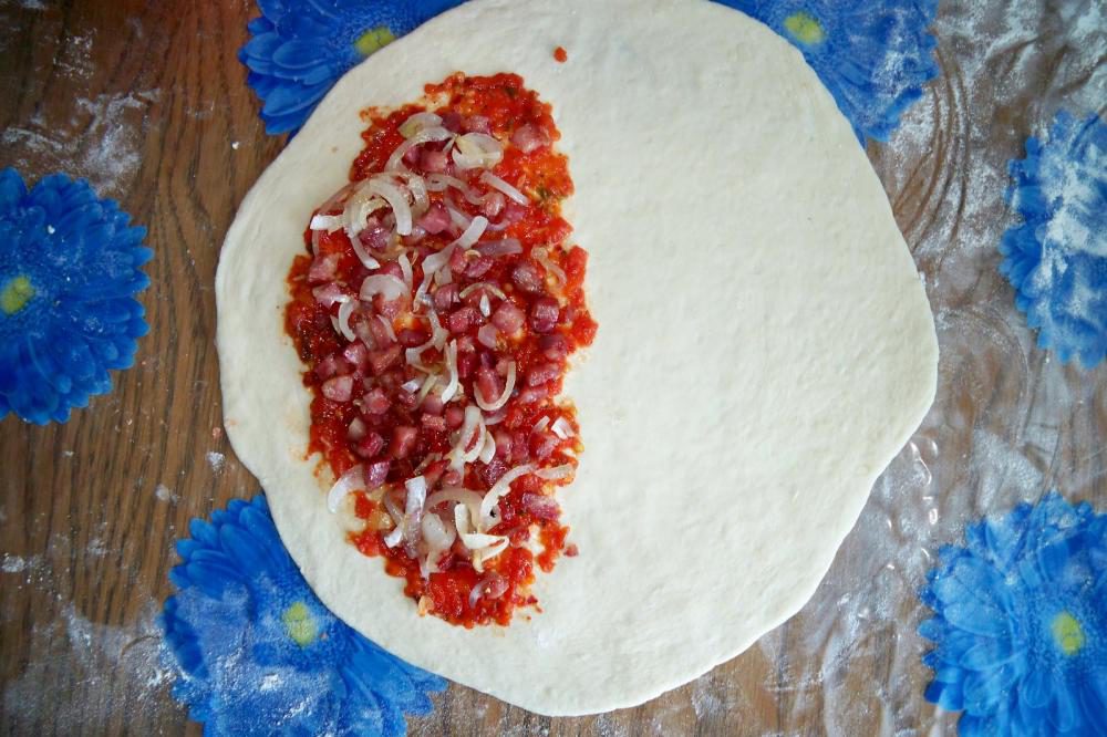 27. Намажьте на основу немного соуса, отступив от края сантиметр или полтора. Положите сверху домашние колбаски и жареный лук.