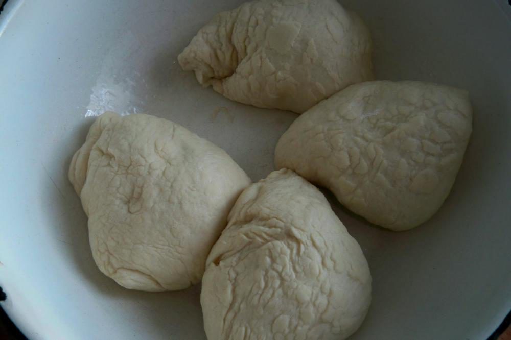 26. Теперь возьмите скалку и раскатайте каждый кусок теста в круг примерно 25 сантиметров в диаметре. Возможно, придется немного растянуть тесто пальцами.