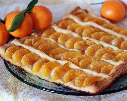 Мандарины очистить, разобрать на дольки, удалить внутренние перепонки и косточки, выложить на тесто. Полосками теста проложить ряды мандариновых долек. Присыпать оставшимся сахаром и поставить в разогретую до 200 С духовку приблизительно на 30 минут.