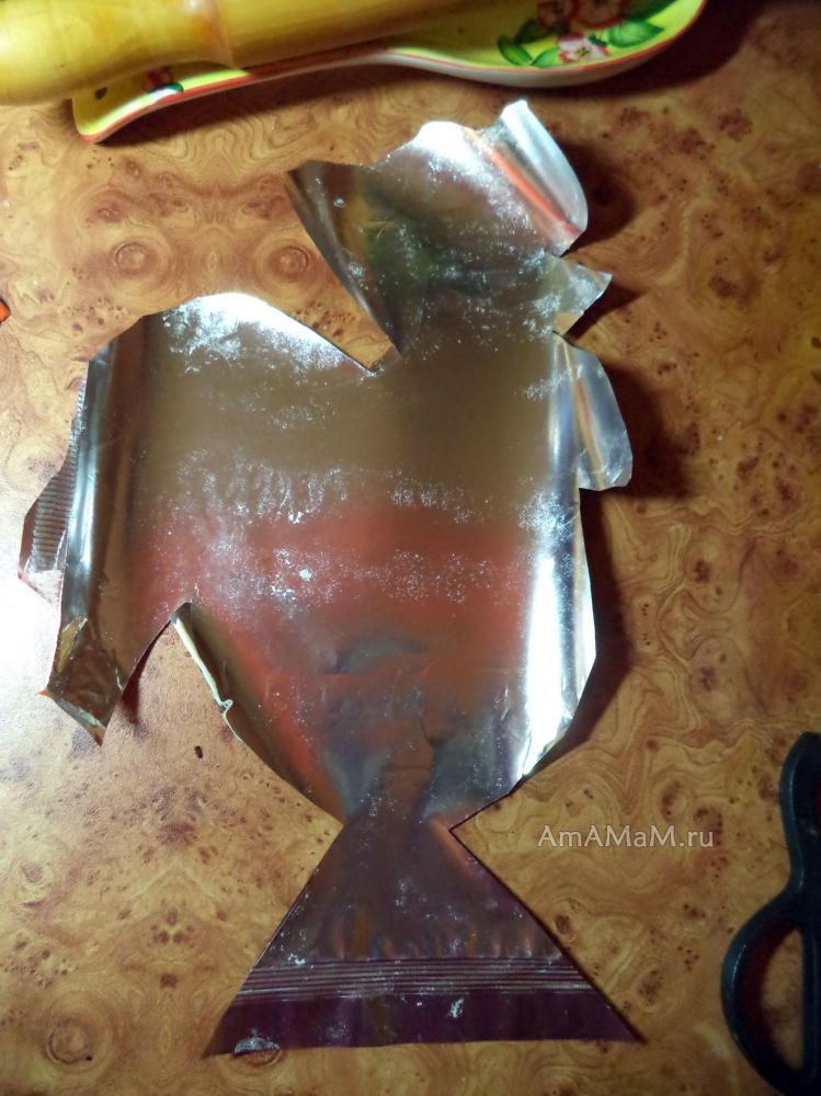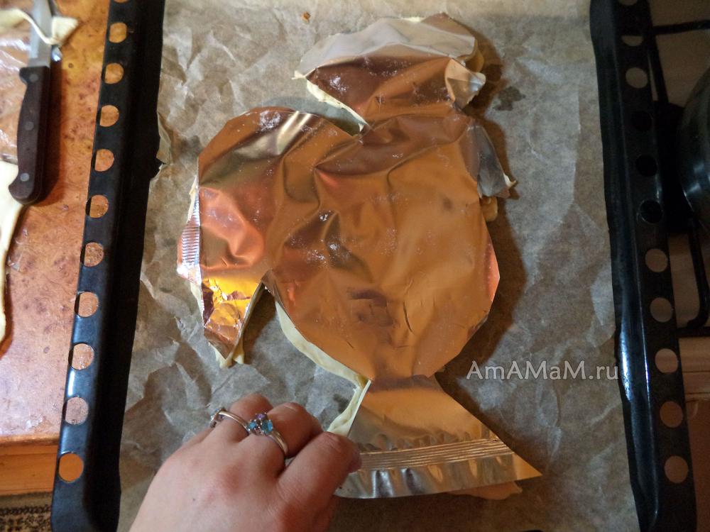 Сделать поверхность для раскатки из упаковки теста: Разрезать упаковку по шву с 2 сторон так, чтобы ее можно было развернуть в длинный прямоугольник (на ней будем раскатывать, но можно и на столе, посыпанном мукой). Если упаковки из фольги нет или она порвалась, то для выкройки-петушка можно использовать бумагу для выпечки или пергамент. Тогда вы просто по шаблону можете врезать обоих петушков (по контуру, как я – второго петуха).