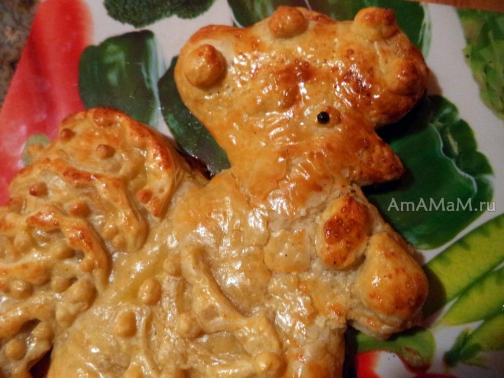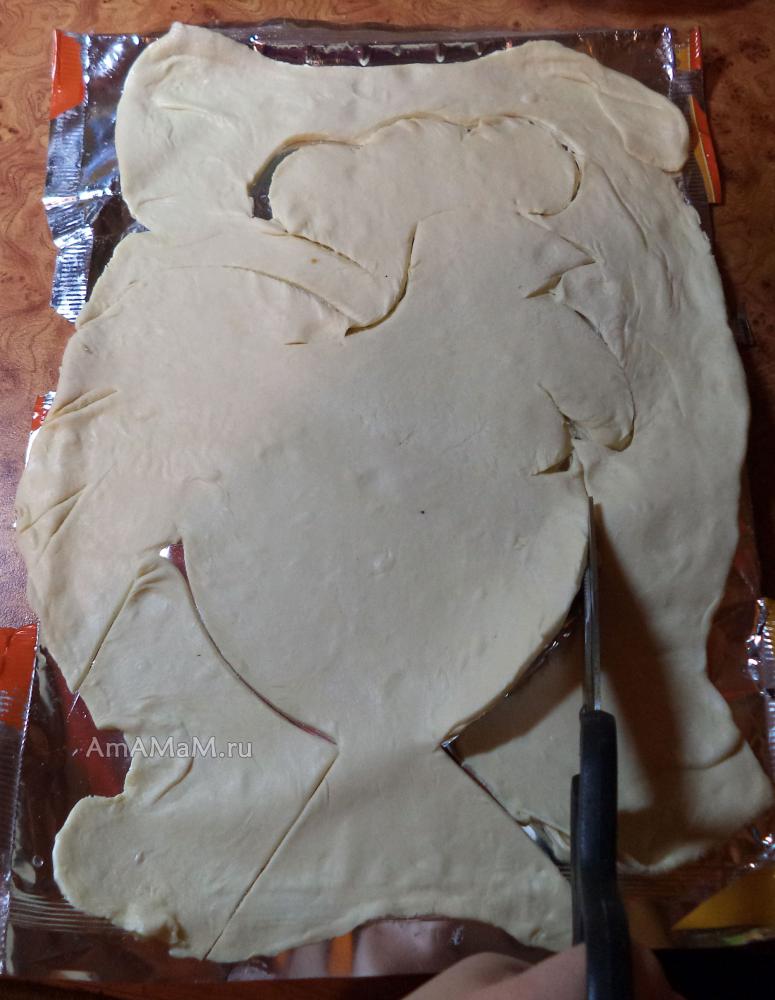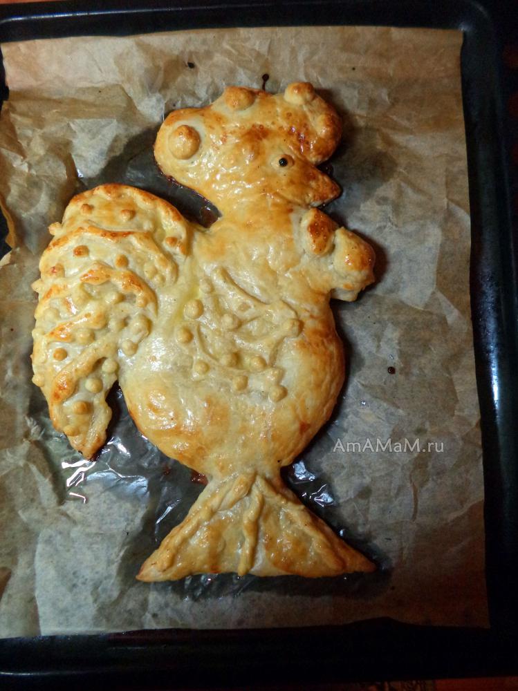 Этот пирог в форме петуха я пекла из покупного замороженного теста (но можно и из другого слоеного или обычного дрожжевого). Вкусно, быстро и несложно.