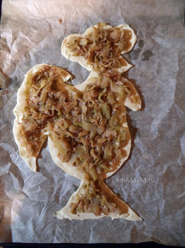 Выложить начинку: на основу пирога выложить подготовленную заранее начинку (у меня была капустная, ниже расскажу, как ее делать). Равномерно распределить ее, отступив от края 1 см (это место для соединения в верхним пластом теста).