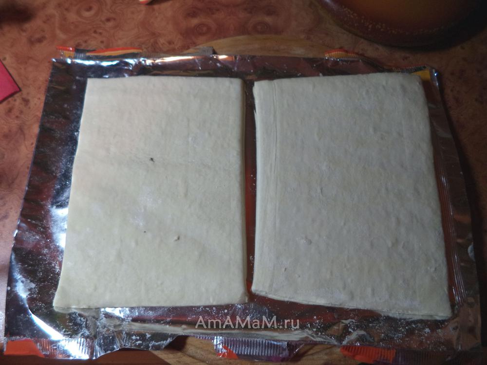 Прочитать инструкцию на упаковке, разморозить так, как там сказано. У меня было 2 пластины (как раз, верх и низ пирога). Если же у вас цельный кусок теста в рулоне, раскатать его и разделить тесто на 2 равные части.