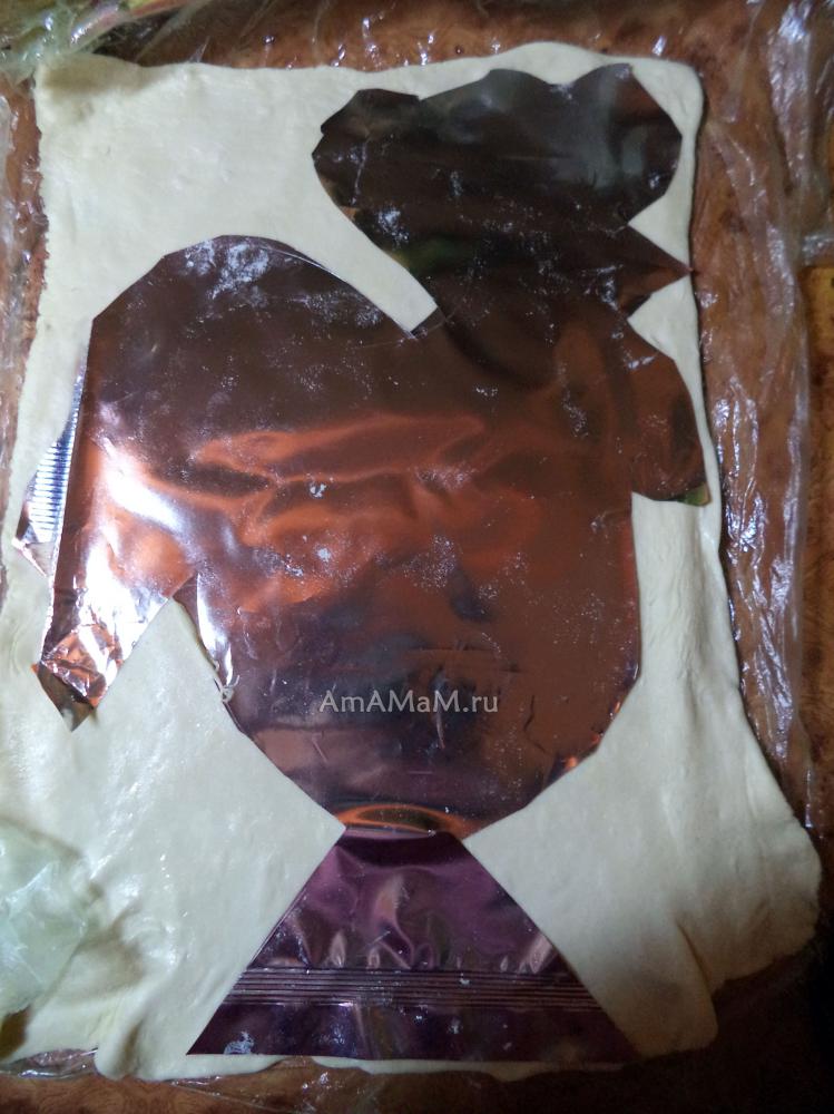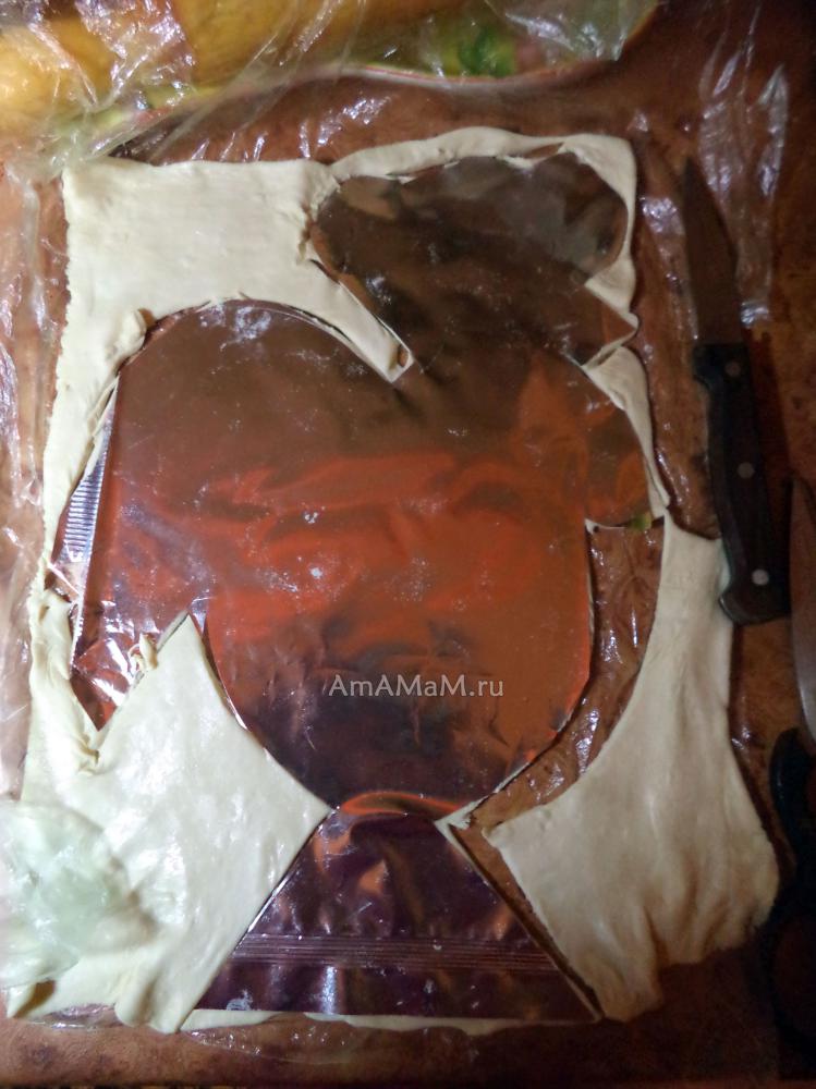 из фольги-упаковки теста (это шаблон, по которому мы вырежем второго петуха из теста. Это будет верх пирога).